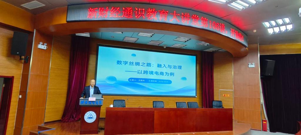 11月17日下午,本学期“新财经通识教育大讲堂”第9讲(总第106期)在国际学术报告厅举行。河北经贸大学国际教育学院副院长王胜利教授受邀为我校师生作题为“数字丝绸之路:融入与治理——以跨境电商为例”的学术报告,讲座由图书馆副馆长王玉卿主持,260余名师生参加。
