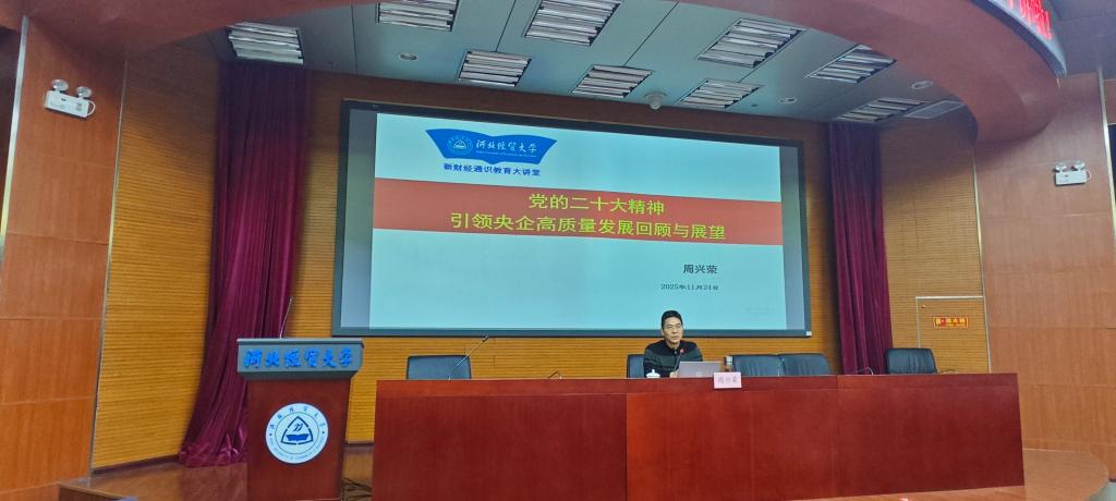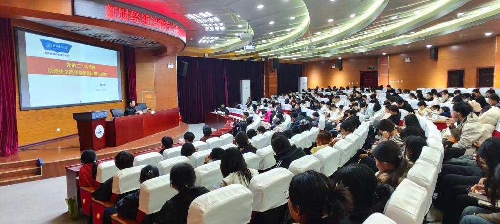 11月24日下午,本学期《新财经通识教育大讲堂》第11讲(总第108期)在国际学术报告厅举行。河北地质大学经济研究所所长、研究生导师周兴荣教授受邀为我校师生作题为“党的二十大精神引领央企高质量发展回顾与展望”的学术报告,讲座由图书馆副馆长王玉卿主持,260余名师生参加。