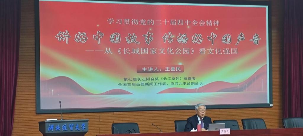 3月9日下午,本学期《新财经通识教育大讲堂》第1讲(总第112讲)在国际学术报告厅举行。原河北电台副台长、中国新闻界最高奖“长江韬奋奖”获得者王喜民教授受邀为我校师生作题为“讲好中国故事,传播好中国声音--从《长城国家文化公园》看文化强国”的学术报告,讲座由图书馆朱丹老师主持,近300名师生参加。