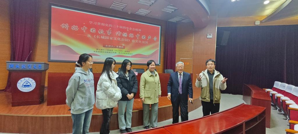 王喜民教授围绕国家建设“长城国家文化公园”的重大决策部署,对“长城国家文化公园”的意义、长城的历史文化、长城的红色文化及传统文化进行了阐释,并从规划引领、保护优先、文化挖掘、活化利用等维度,探讨了新时代背景下长城国家文化公园的高质量发展路径,并通过生动的故事诠释了中国人民团结一致、众志成城的长城精神。整场讲座图文并茂、深入浅出,使在场师生对长城精神内涵有了更为全面、深刻的认识。